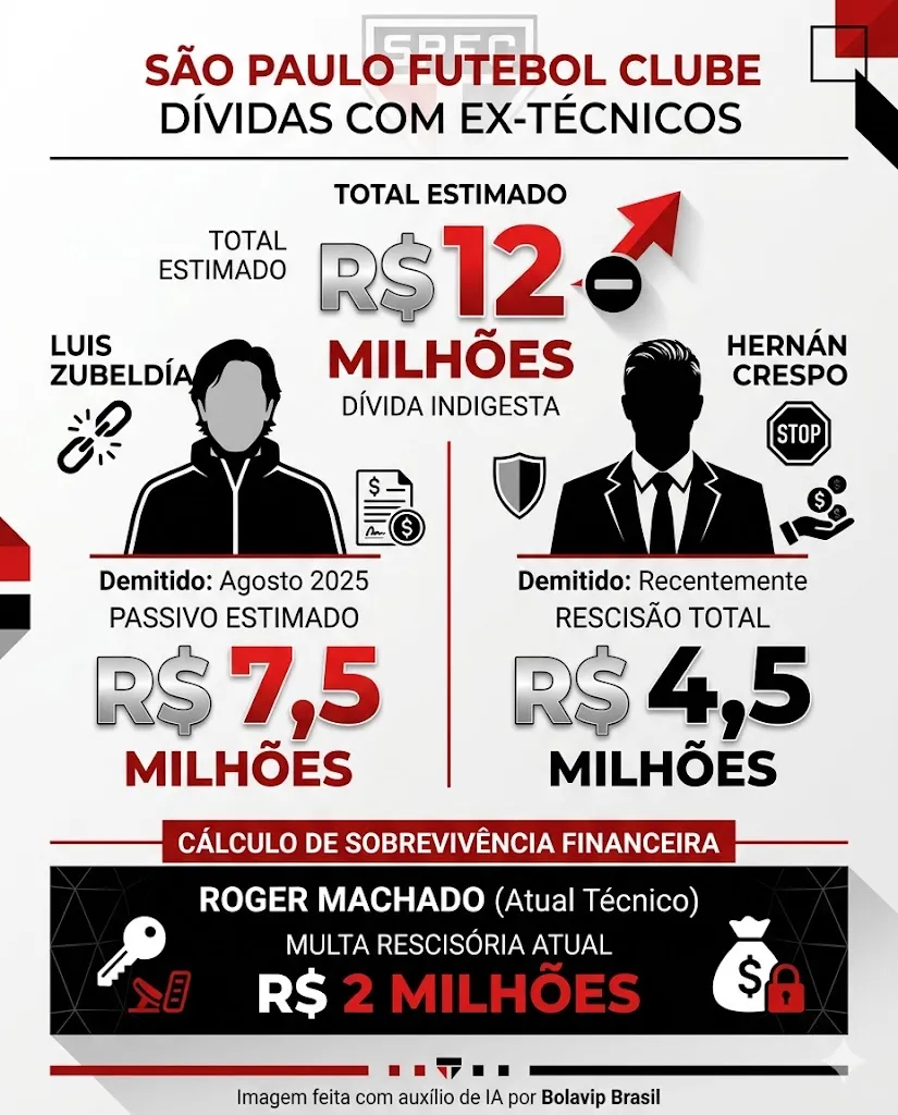 O São Paulo Futebol Clube empilha uma conta indigesta: cerca de R$ 12 milhões em débitos com seus dois técnicos mais recentes, Luis Zubeldía e Hernán Crespo. A fatura chega justamente quando o clube tenta virar a página sob o comando de Roger Machado, como se o passado insistisse em não sair de campo.